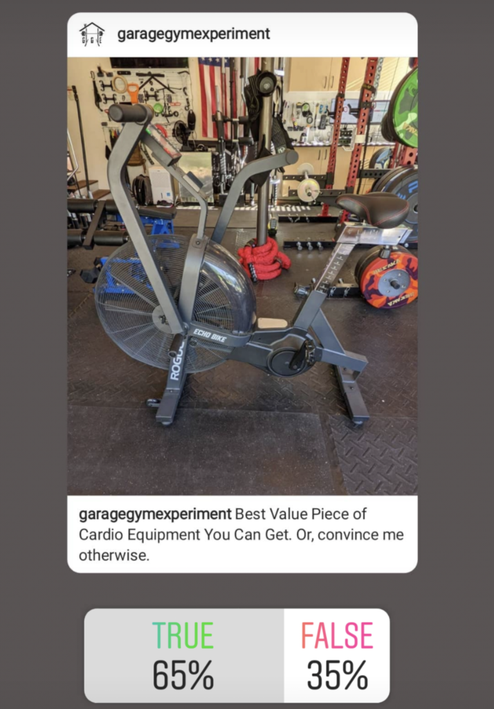 - “What’s your Favorite Piece of Cardio Equipment?” This was asked as a #sundaysurveydiscussion. There weren’t a ton of instructions, so the answers varied. Still, the number one mentioned item was…. the Rogue Echo Bike, which is impressive because those without specific brands mentioned were just added as categories.