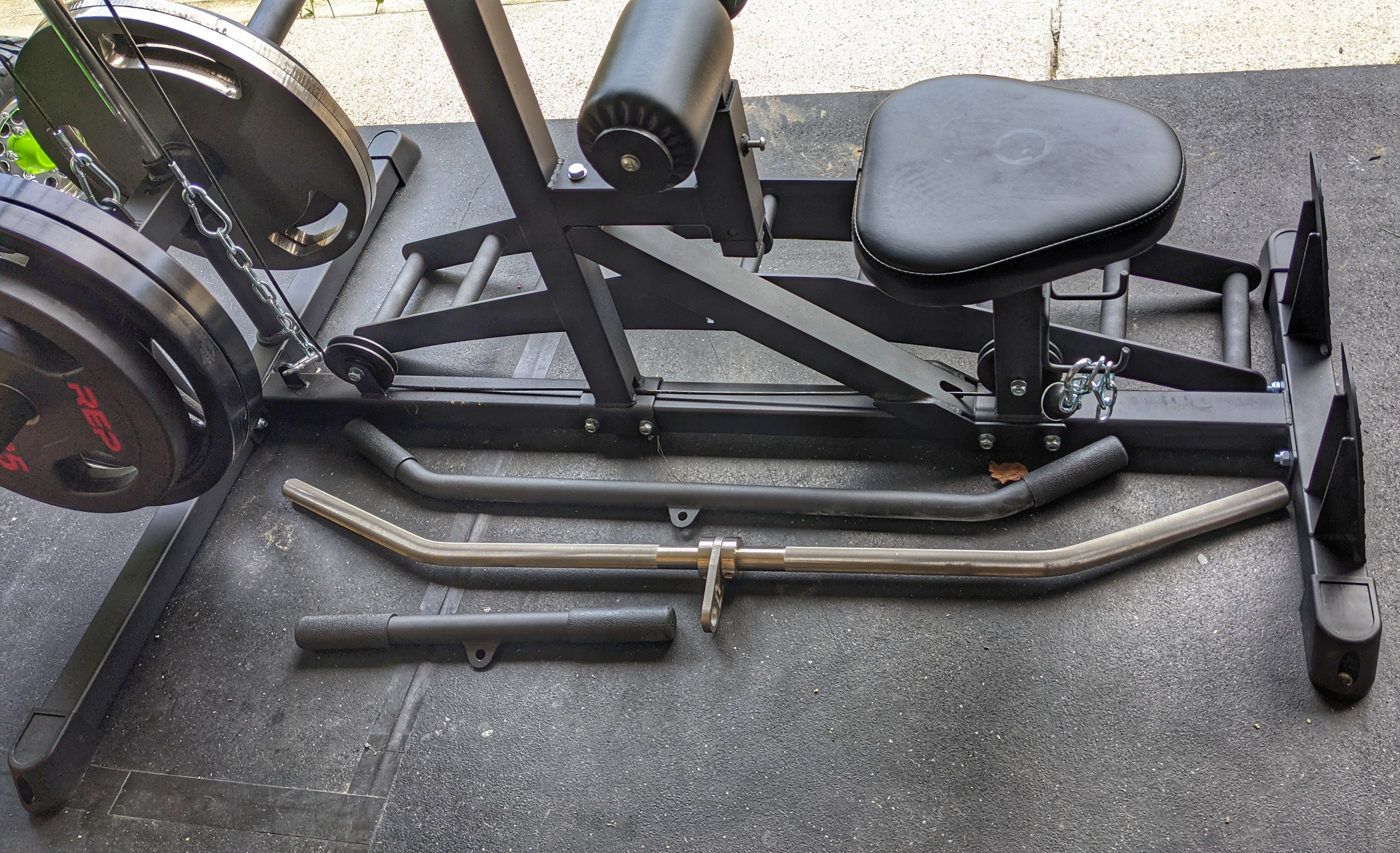 • A basic lat bar (37.5 inches) and a low row handle (15 inches) are included. They’ll get the job done, but you may want to upgrade.
