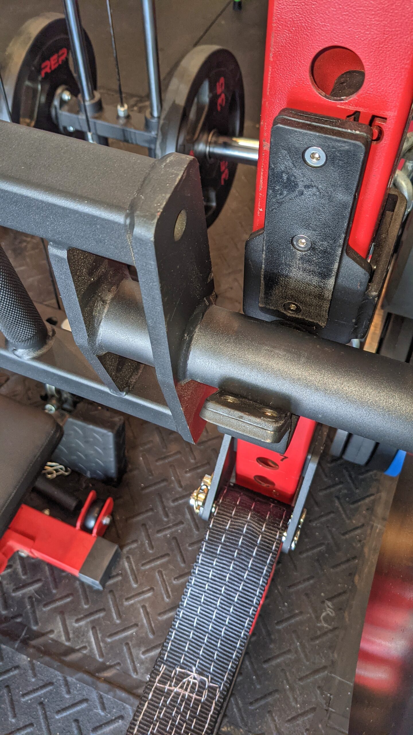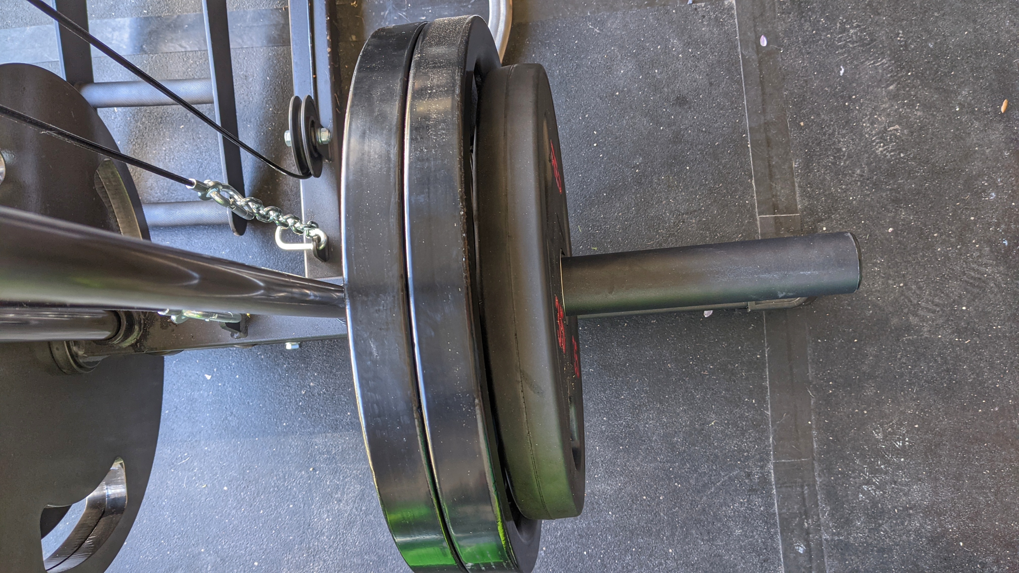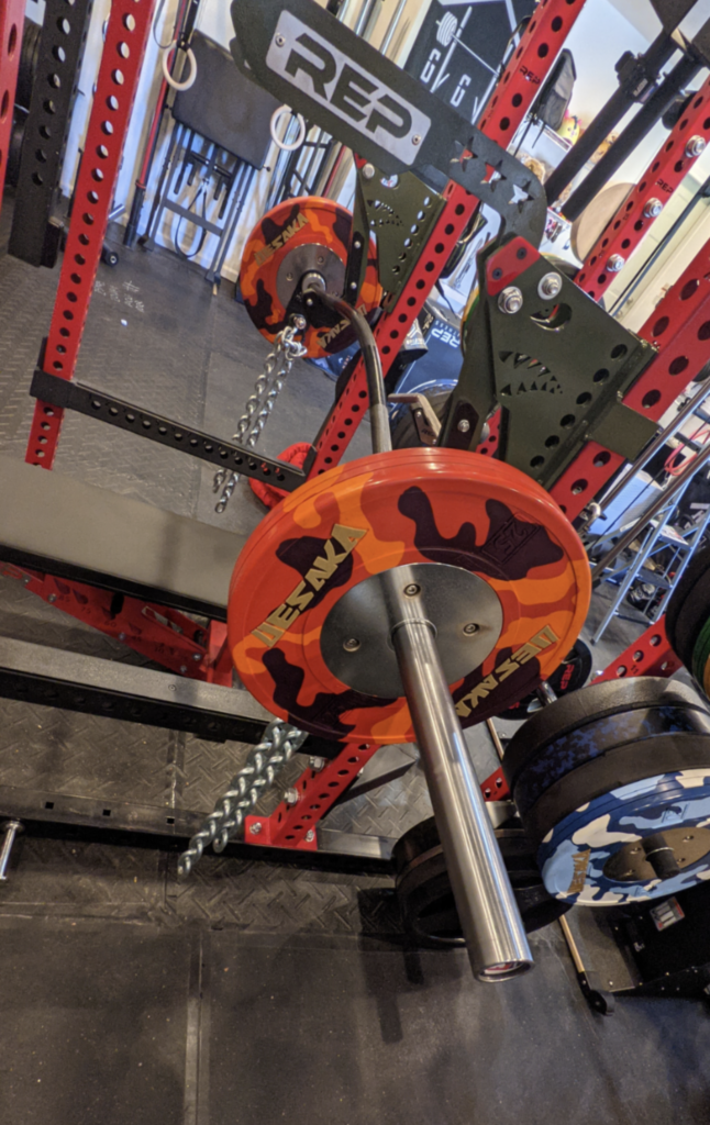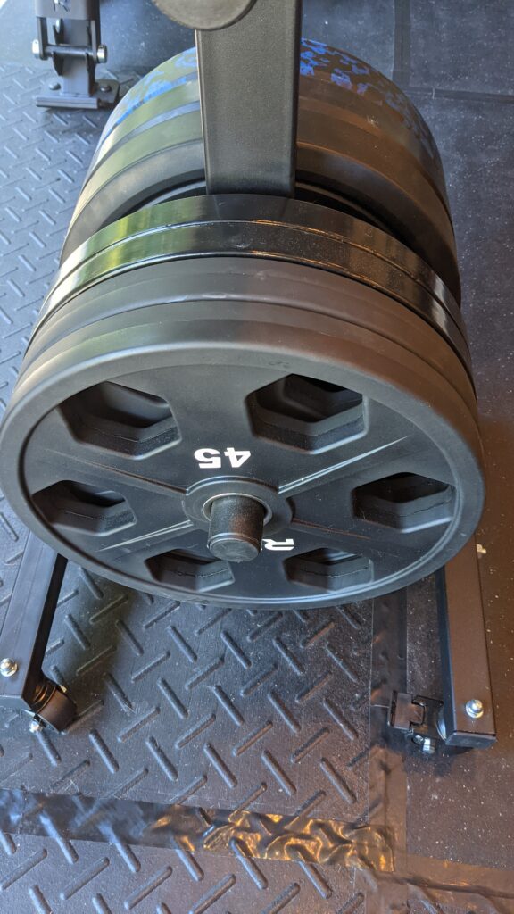 • Caster wheels at the bottom help make this portable. Therefore, you’re able to wheel it around the gym. With a ton of weight, it’s difficult but not impossible to move across the room. For example, you’ll see it loaded up with 735 lbs below. The wheels can also be locked into place when not in use.
