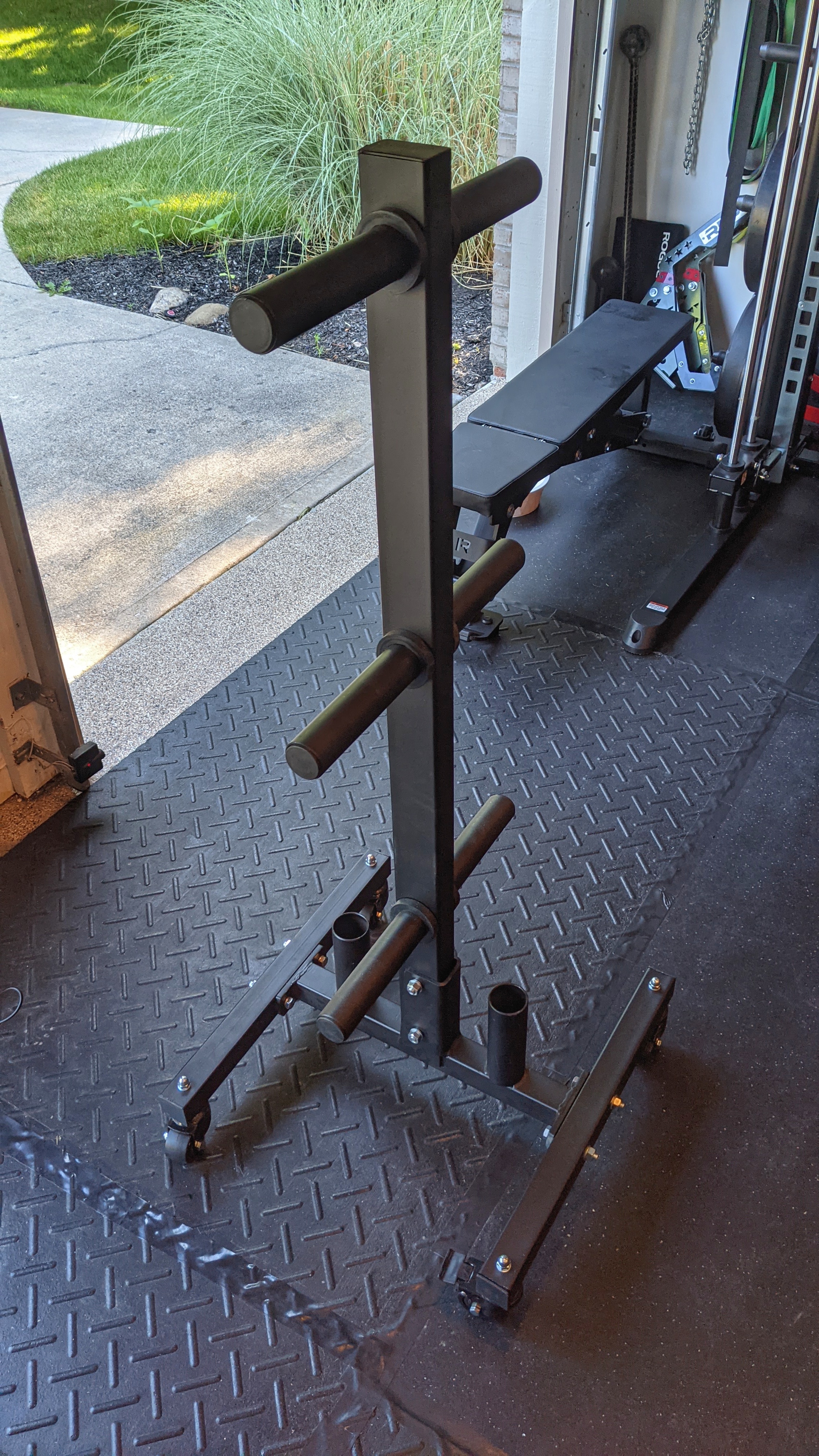 Some common advice from veteran home gym owners is to buy “once cry once” on many of the primary pieces of gym equipment like a bench, squat rack, and barbell. However, they also mention that this is not as important on “accessory type” objects. For those building out their home gym one step at a time and on a tight budget, it’s recommended to save where you can. Certain items will “just get the job done,” and there is no need to get something fancy. This Portable Plate and Barbell Storage Tree is an example of that, which will do a fine job storing your weight plates and barbells.