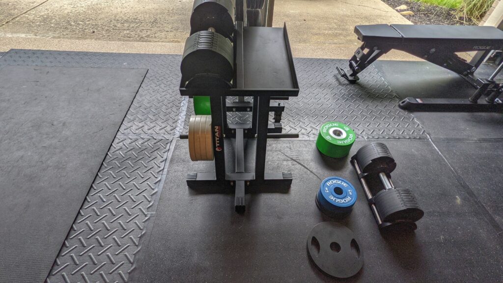 Below is a look at the V3 Dumbbell Stand and Plate Tree. This stand is designed to hold a pair of dumbbells (adjustable or not) plus smaller plates at the bottom. With the option to hold additional weight, it’s more versatile than other options on the market. Plus, it’s cheaper than most alternatives. The stand is solidly built and ensures a better experience using adjustable dumbbells than without a stand.