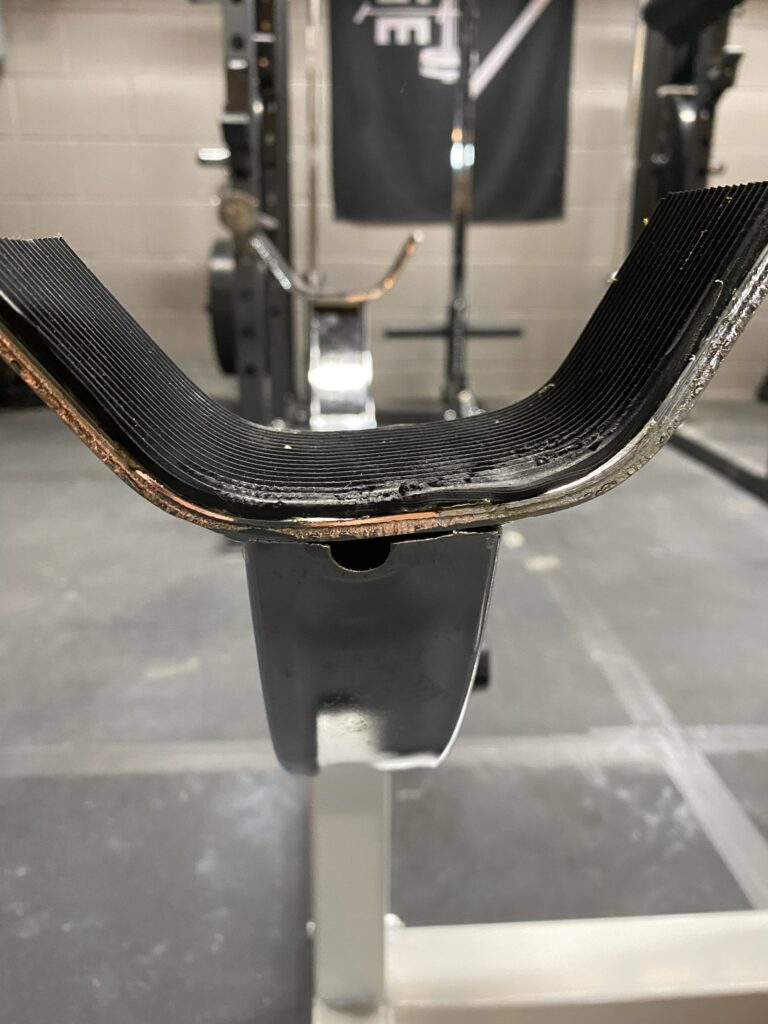 6. Bar Holding Arms: The arms meant to hold the bar are lined with cheap rubber strips. The welding on the underside is also questionable/non-existent. The claws where the bar rests also line up where you would want to grip an EZ bar which makes it less than ideal for gripping the bar before your set and racking.