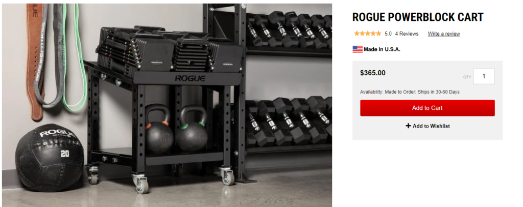 • Rogue also offers a Powerblock Cart that has some additional space for other items like kettlebells. The price is listed below 😲.
